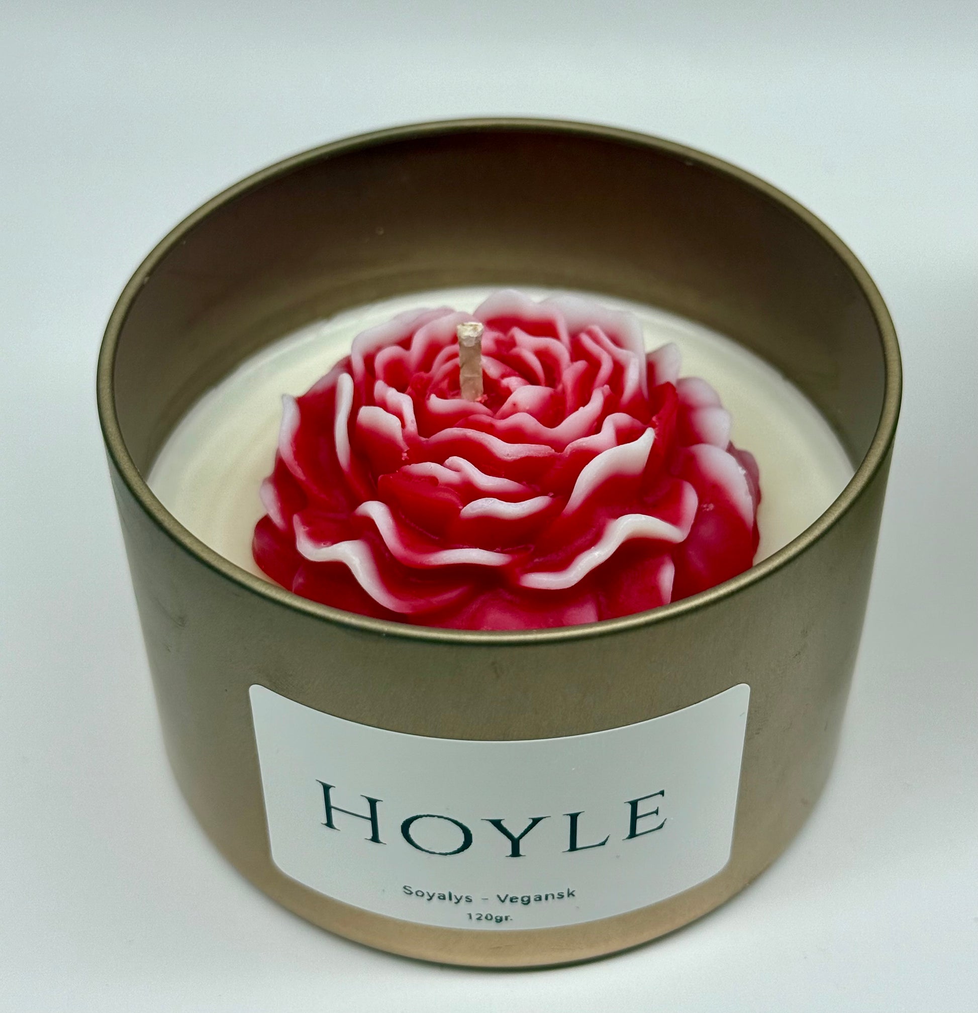 Soyavokslys formet som blomstrende roser. Hver variant kombinerer vakkert design med nydelige dufter, og gir en varm, innbydende atmosfære. Leveres i gullfarget tinnboks – perfekt som gave eller for å skape en luksuriøs stemning hjemme.
